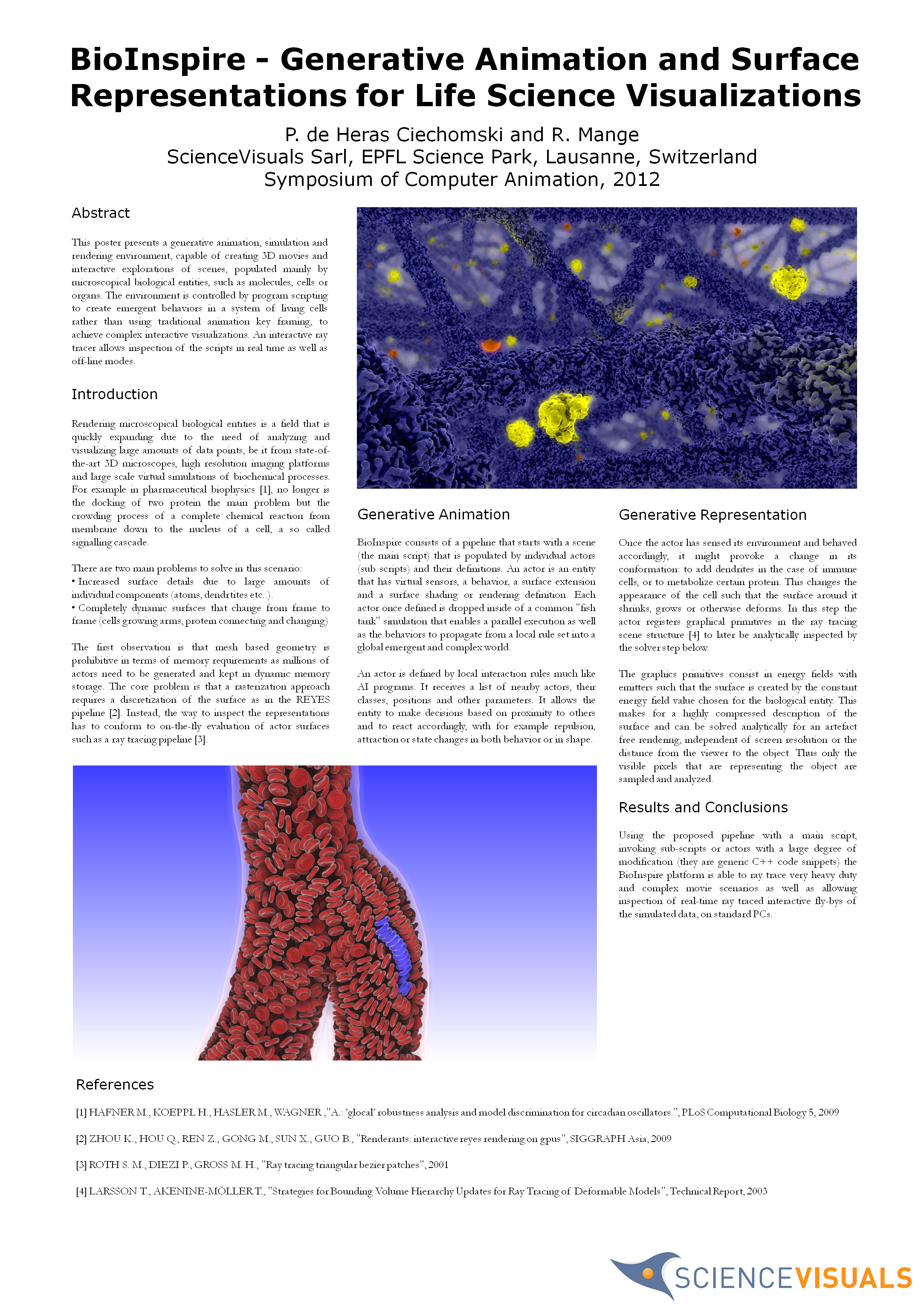 - “BioInspire - Generative Animation and Surface Representations for Life Science Visualizations” by Pablo de Heras Ciechomski and Robin Mange, Eurographics and ACMSIGGRAPH Symposium on Computer Animation SCA, EPFL, Lausanne, Switzerland, 2012.